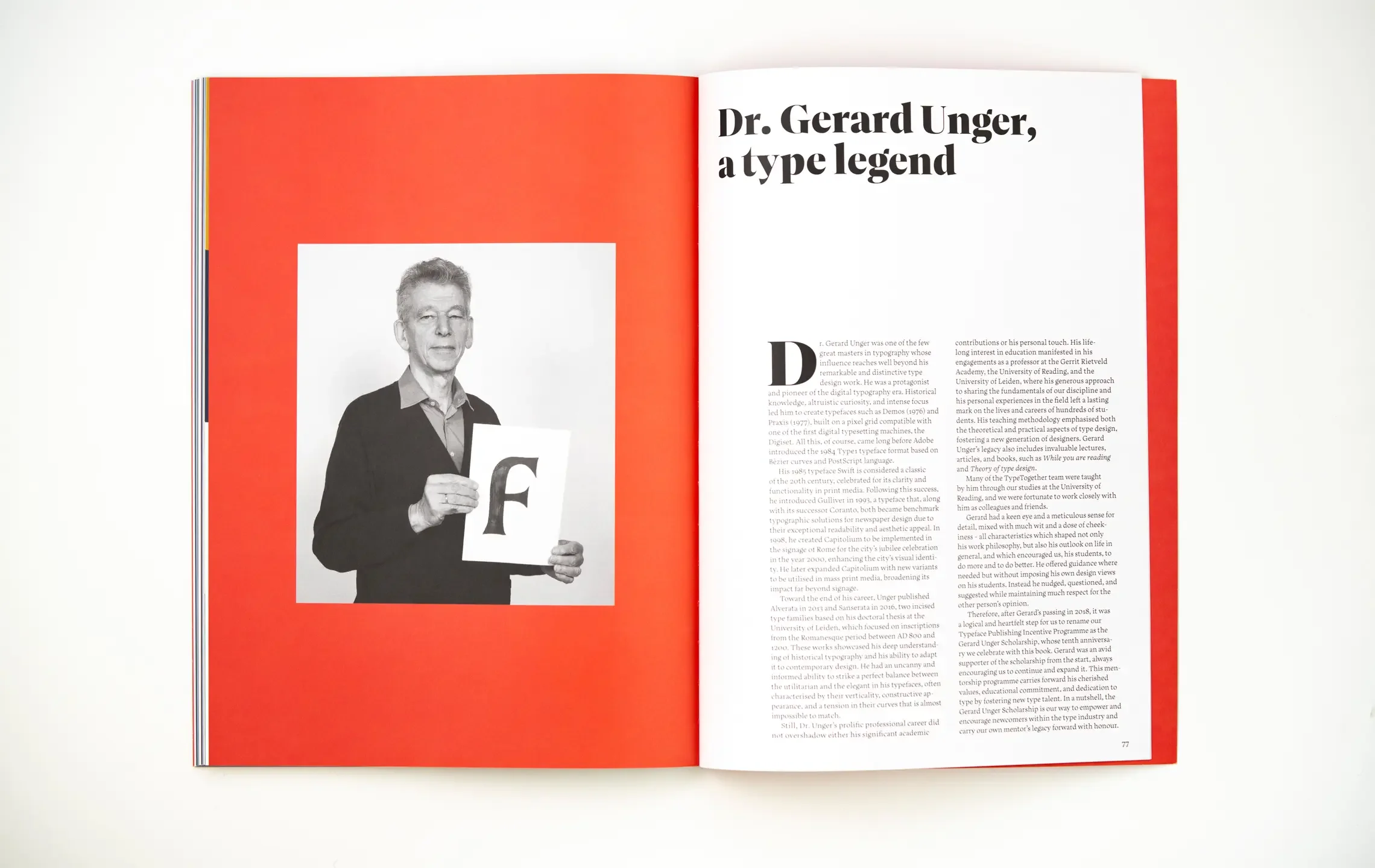 Named after one of the alchemists and godfathers of type design, Dr. Gerard Unger (1942–2018), the scholarship celebrates the melding of creativity and functionality. It shows how a positive outlook can impact an entire design category, raising its overall value globally, and setting the bar for future design work primarily committed to serving and benefitting others. It recognizes the value of progressing together toward an interconnected and cosmopolitan future driven by fearless innovation, deep research, aesthetic beauty, and steadfast goodwill.